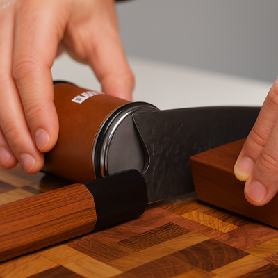 Veldu einfaldlega hornið (15° eða 20°), festu hnífinn við segulinn og brýndu mjúklega – lokið með fínpússun.